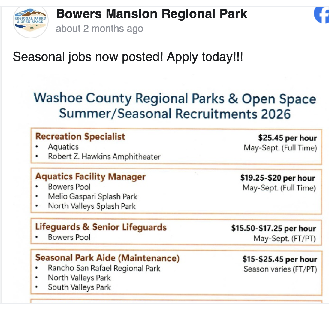 Below is a partial list of summer jobs available at the park and swimming pools posted on the park website.