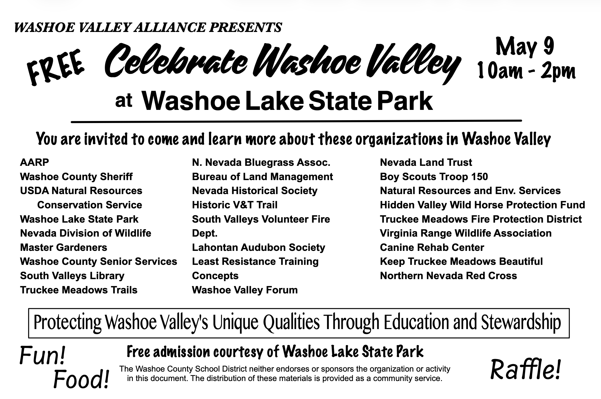 Join us in this annual event to meet your neighbors and those organizations that affect and contribute to life in Washoe Valley and the surrounding area. See You There!