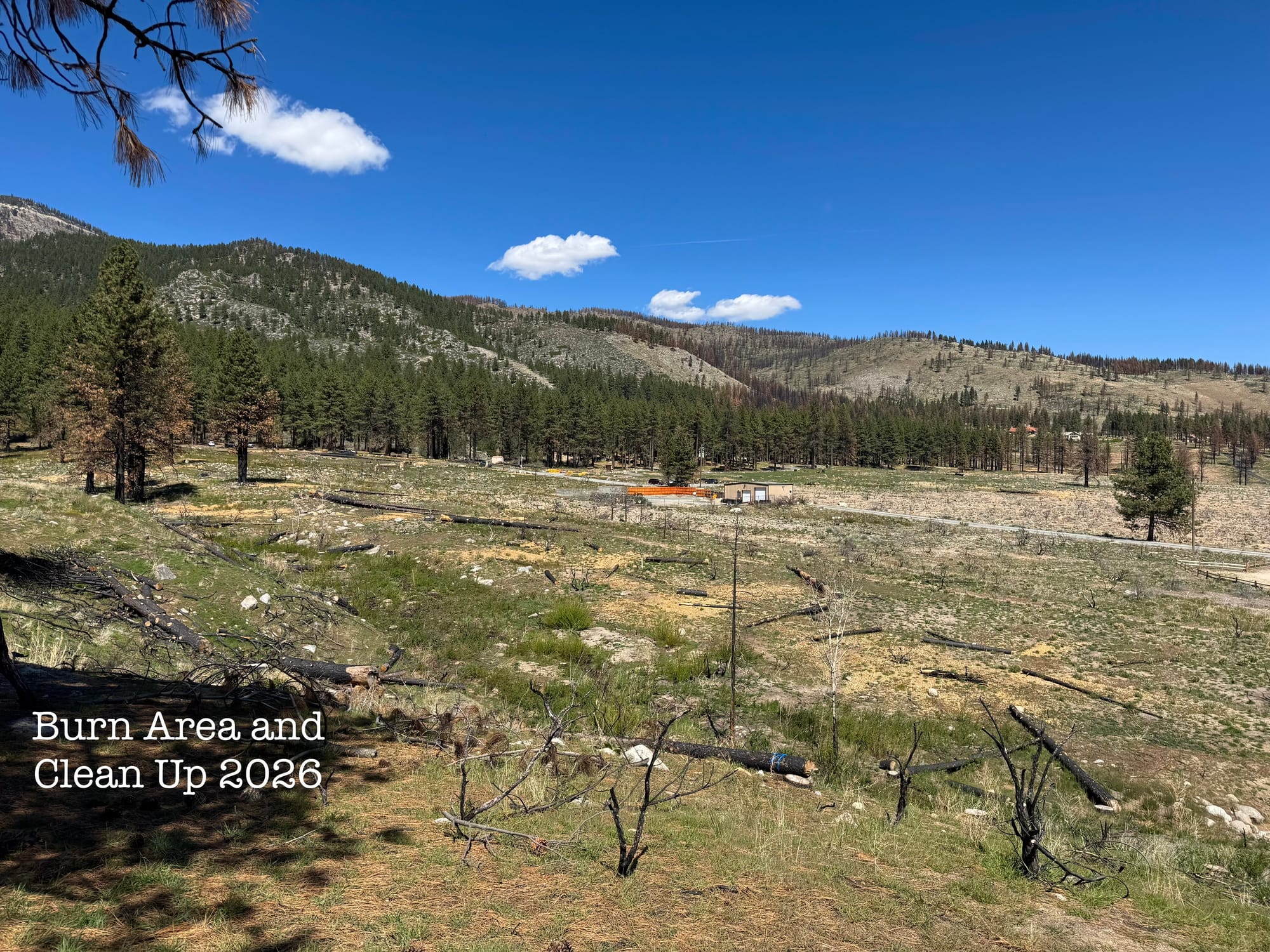Driving up the entrance lane from Old 395, the sides of the road are bare, with low grasses and bushes emerging among black trunks of burned trees that have been cut down. You can see on the hills to the right, the brown patches of forest that burned. In a pattern that is common in forest wildfires, The fire left patches of unburned trees within the fire perimeter. These trees will provide seeds to eventually fill in the burned areas. This is tempered by our dry climate and poor soils that will make the recovery slow and will take many years.
