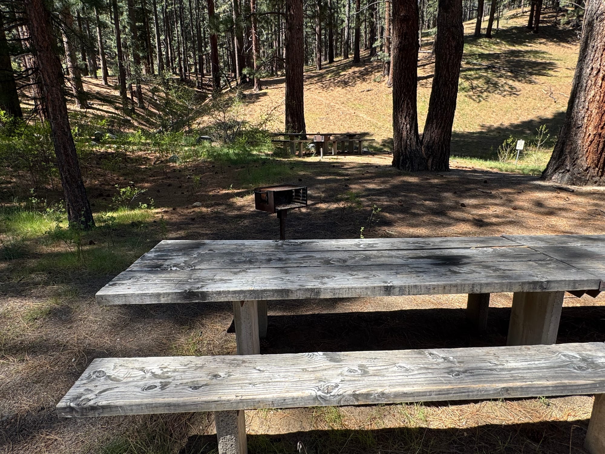 Further on, you enter the area of tall pines and the creek and curve around back to the parking, picnic area and entrance lane. We noticed there are still grill stands amongst the scattered picnic tables. Hopefully the park will have developed a better method of enforcing burn bans on windy days.